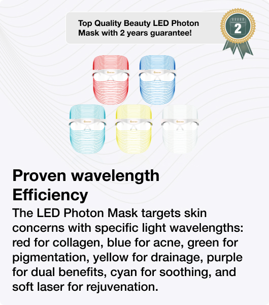 Proven Wavelength Efficacy: With specific wavelengths for each light mode, the LED Photon Mask ensures targeted and effective treatment. Red light stimulates collagen production and reduces wrinkles, blue light targets acne-causing bacteria, green light helps with hyperpigmentation, yellow light promotes lymphatic drainage, purple light combines the benefits of red and blue lights, cyan light soothes inflamed skin, and soft laser light rejuvenates the skin at a cellular level. This precise wavelength selection enhances the overall efficacy of the mask, making it a reliable solution for various skincare needs.