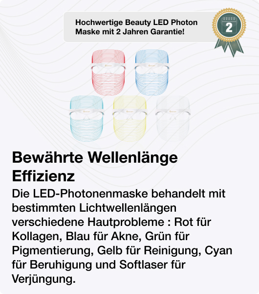 Bewährte Wellenlängenwirksamkeit: Mit spezifischen Wellenlängen für jeden Lichtmodus sorgt die LED-Photonenmaske für eine gezielte und effektive Behandlung. Rotes Licht stimuliert die Kollagenproduktion und reduziert Falten, blaues Licht bekämpft Akne verursachende Bakterien, grünes Licht hilft bei Hyperpigmentierung, gelbes Licht fördert die Lymphdrainage, violettes Licht kombiniert die Vorteile von rotem und blauem Licht, cyanfarbenes Licht beruhigt entzündete Haut und weiches Laserlicht verjüngt die Haut auf zellulärer Ebene. Diese präzise Wellenlängenauswahl erhöht die Gesamtwirksamkeit der Maske und macht sie zu einer zuverlässigen Lösung für verschiedene Hautpflegebedürfnisse.