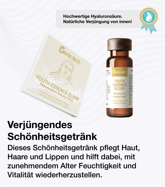 Verbesserte Hautfeuchtigkeit und Ausstrahlung: Hyaluronsäure (HA), Fischkollagen und Elastinpeptide: Mit zunehmendem Alter produziert der Körper weniger Hyaluronsäure, eine Schlüsselkomponente, die für die Aufrechterhaltung der Hautfeuchtigkeit verantwortlich ist. Die Kombination aus Hyaluronsäure, Fischkollagen und Elastinpeptiden des Schönheitsgetränks trägt dazu bei, die Feuchtigkeit der Haut wieder aufzufüllen und zu speichern. Diese verbesserte Feuchtigkeitsversorgung trägt zu einer verbesserten Hautelastizität, Festigkeit und einem strahlenden Teint bei. Dadurch können feine Linien und Fältchen weniger ausgeprägt erscheinen, was zu einem jugendlicheren Aussehen führt.