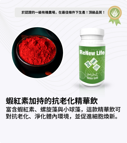 我們的產品融合了三種超級食品:有機生物螺旋藻、有機生物小球藻和優質蝦紅素,提供豐富的維生素、礦物質和抗氧化劑,全面支持您的健康和活力。