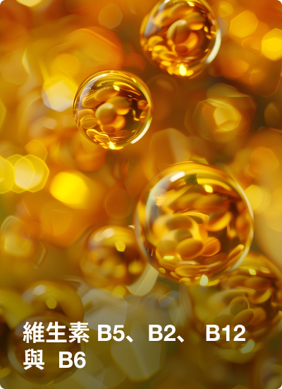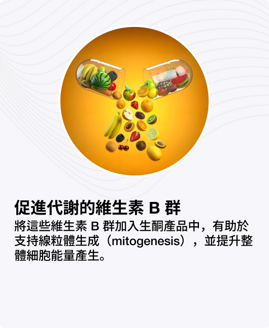 維生素 B2(核黃素)、B3(菸鹼酸)與 B5(泛酸)在細胞代謝與能量生成中發揮關鍵作用。它們參與線粒體功能,以及將巨量營養素分解以產生能量等過程。