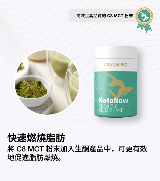 C8 MCT 可快速吸收並轉化為酮體,在生酮狀態下為身體提供能量,提升燃脂效率、增加活力並支持體重管理。
